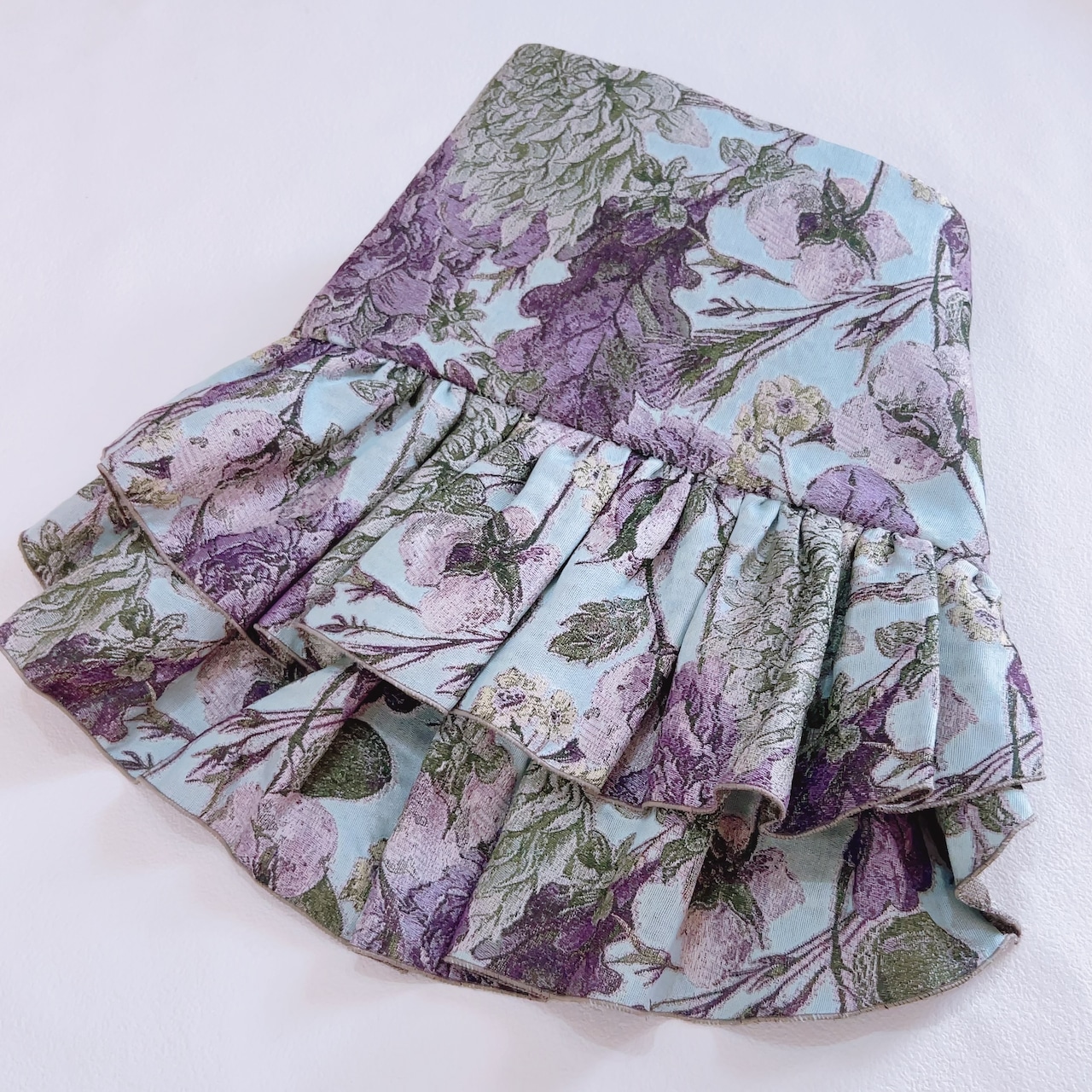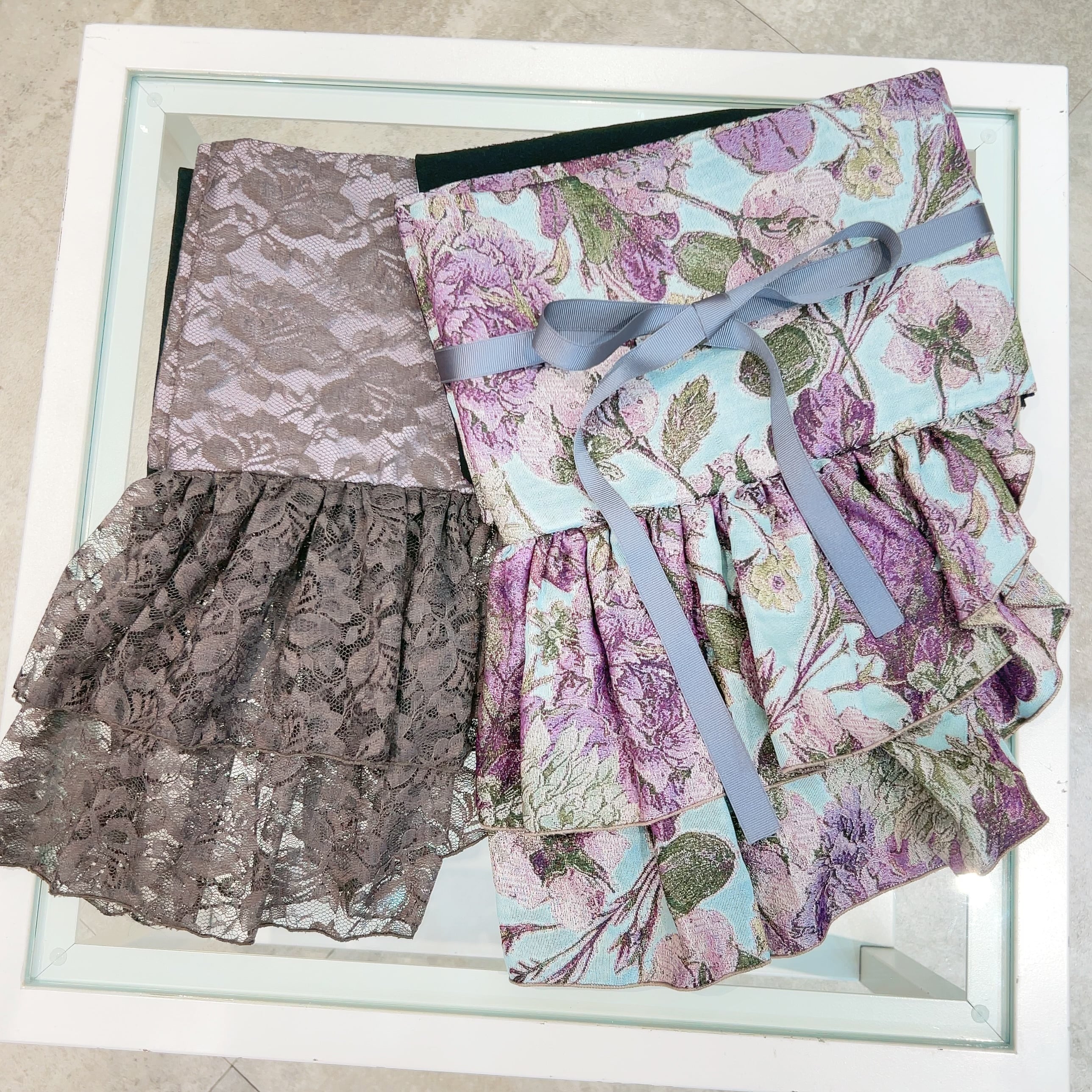 バッスルのように後ろのみレースや生地などを二重にしてボリュームをだしております。