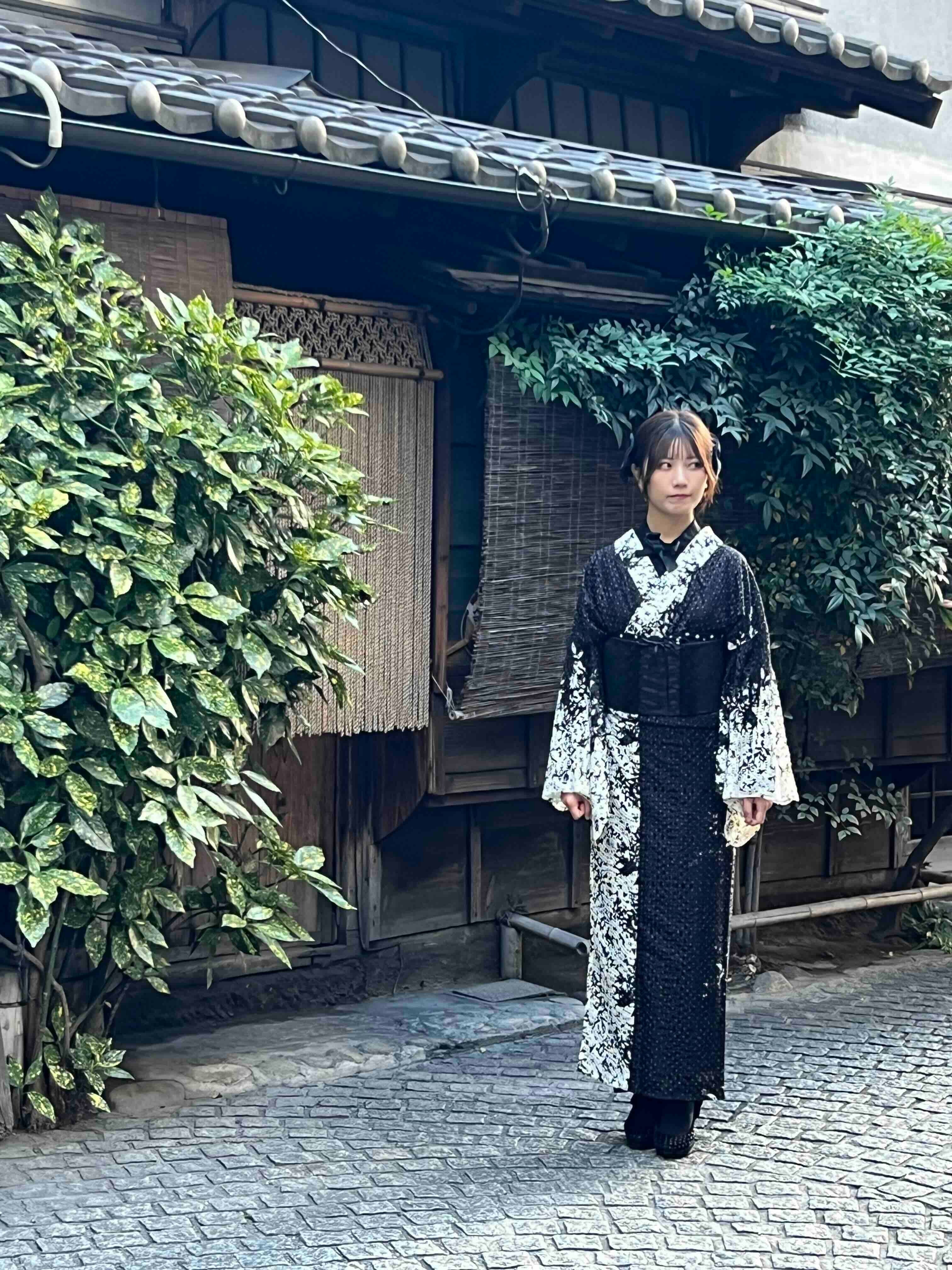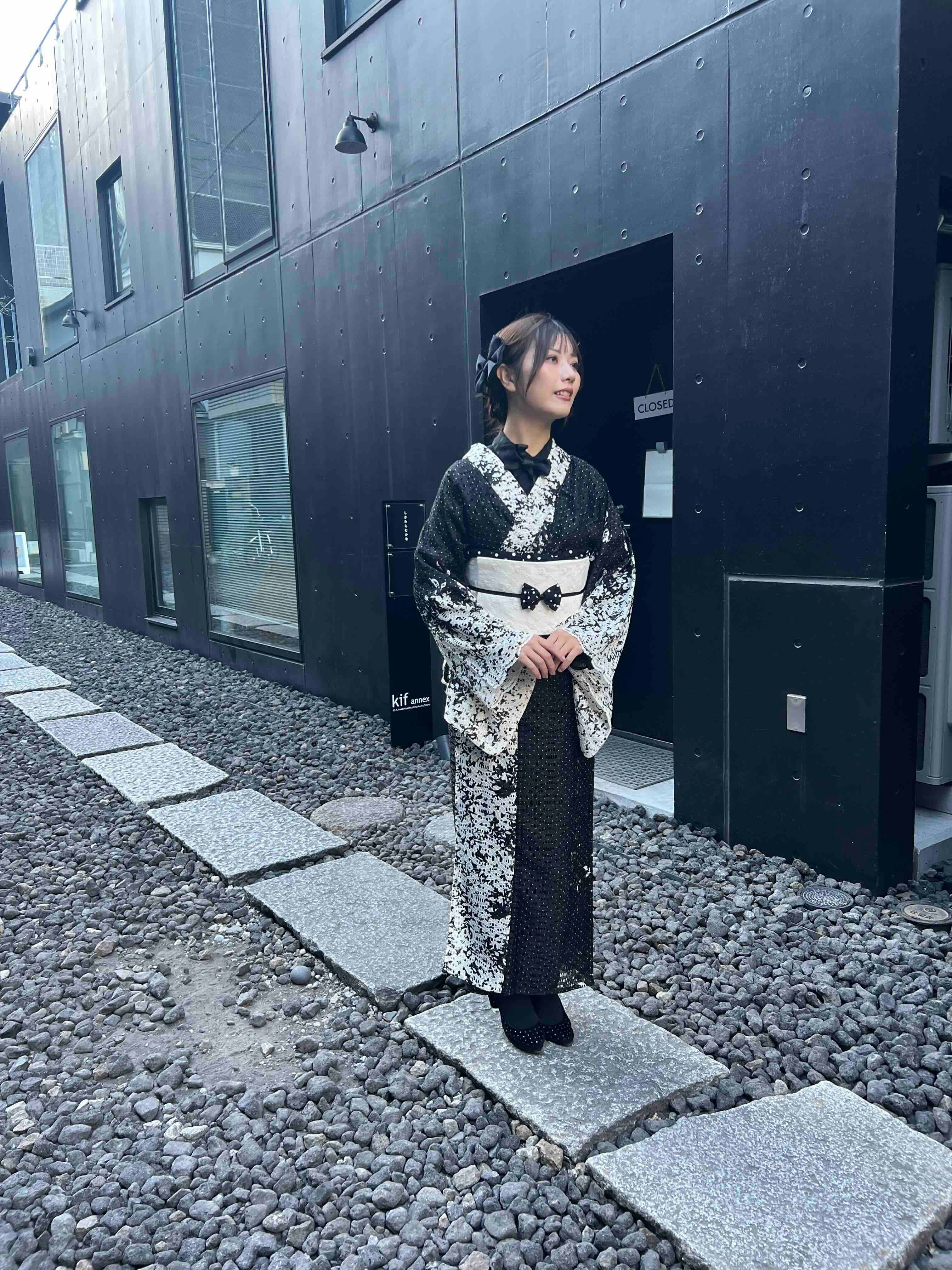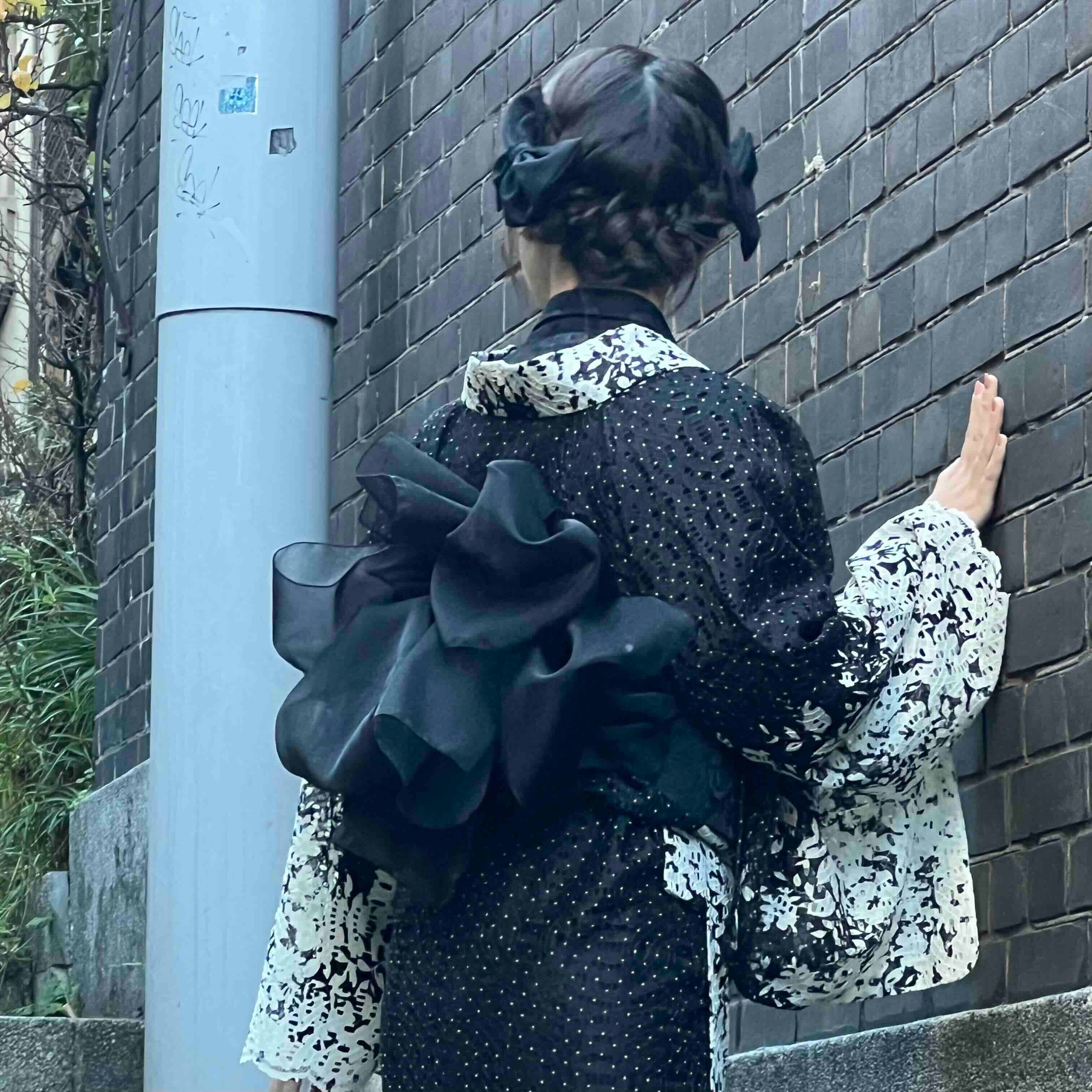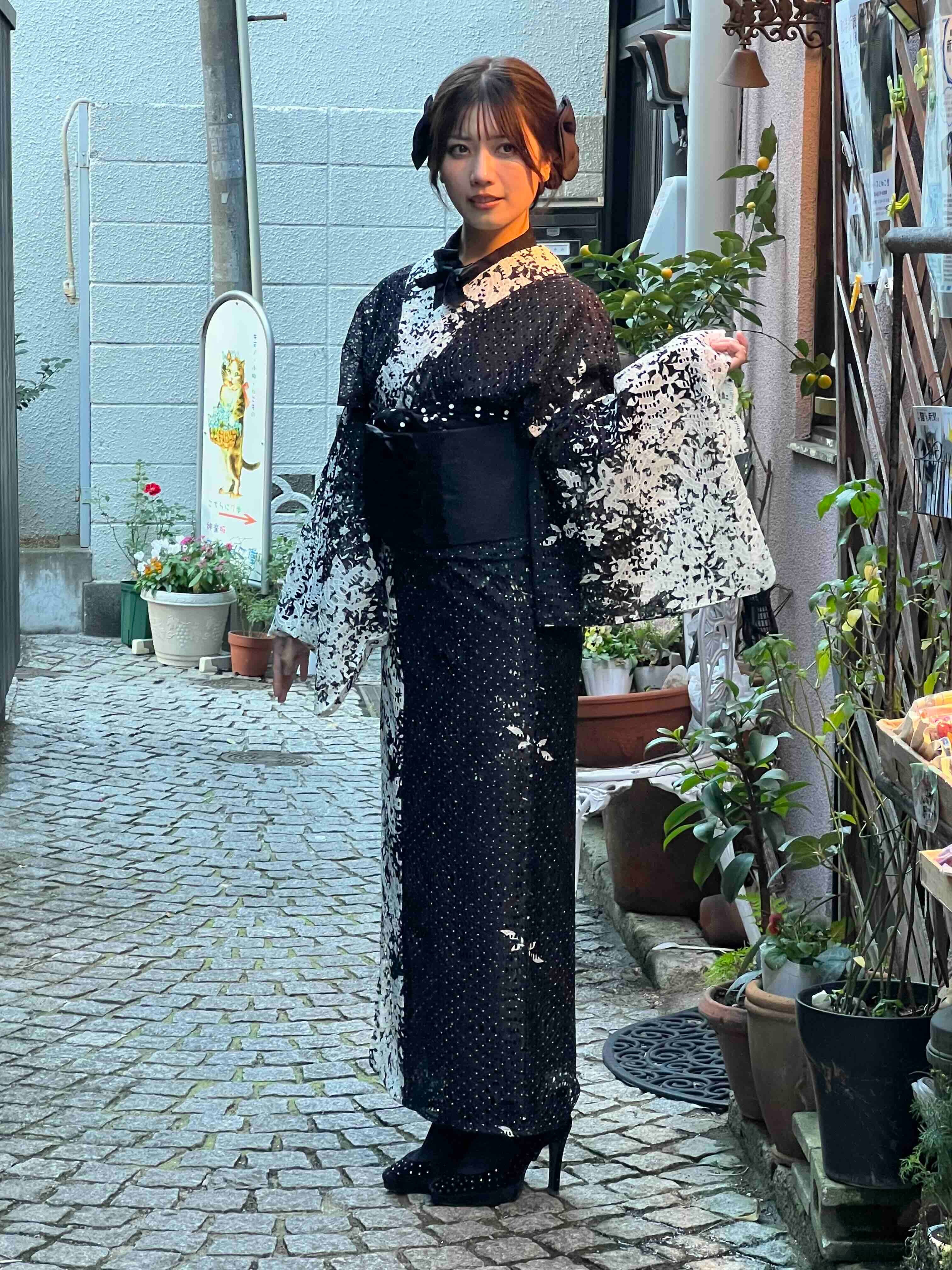 ペタルレース着物【単衣】ブラック