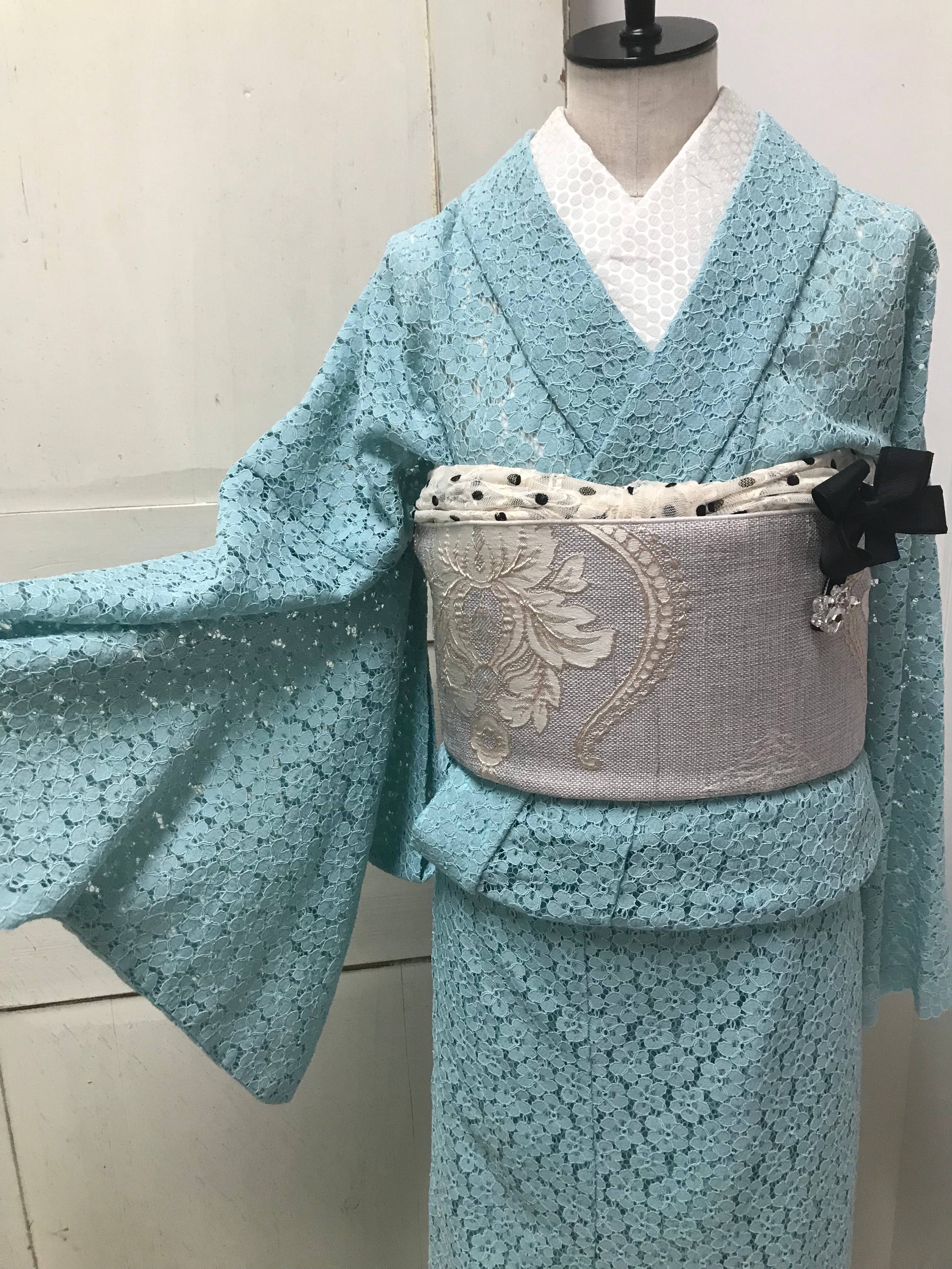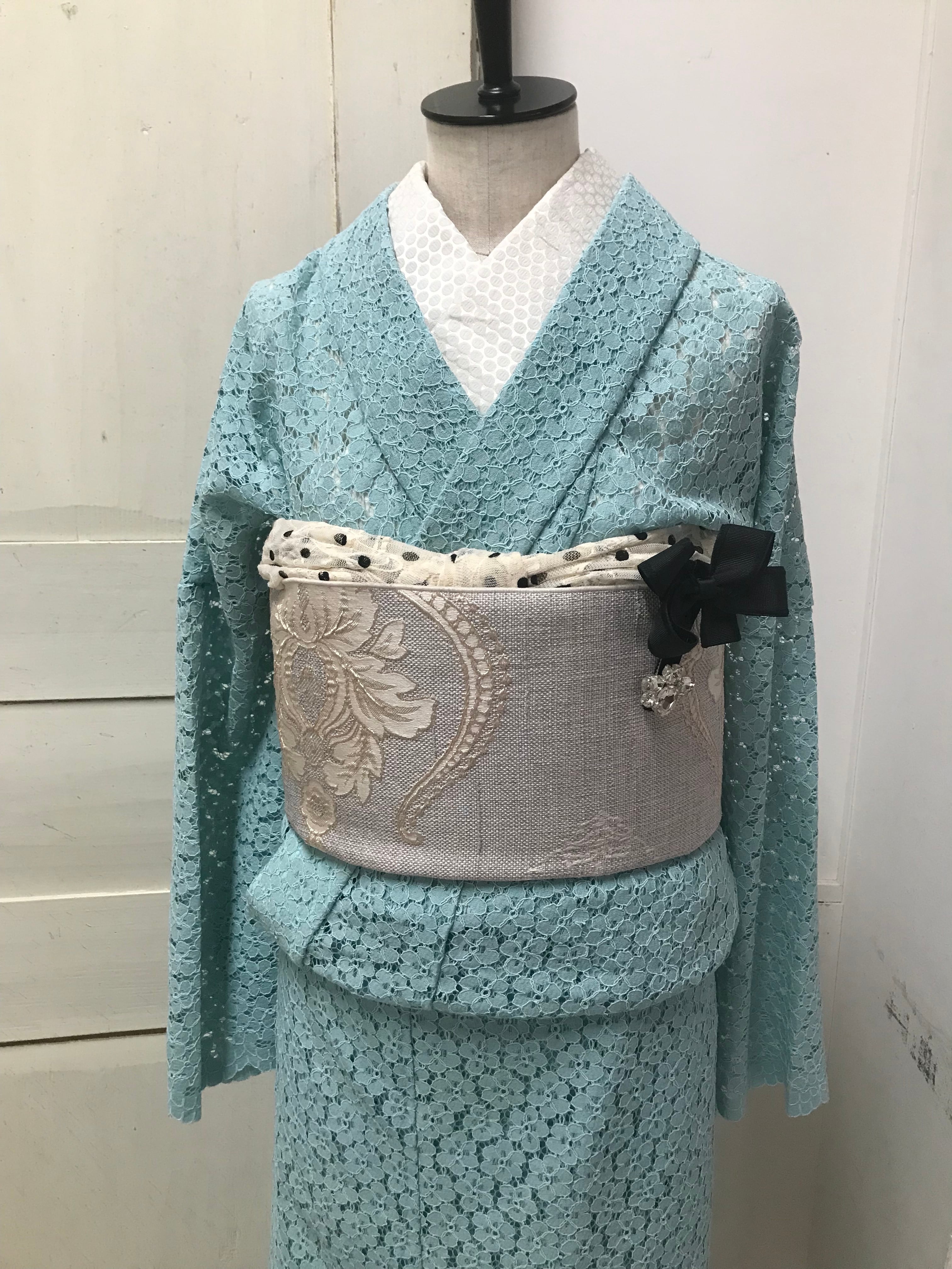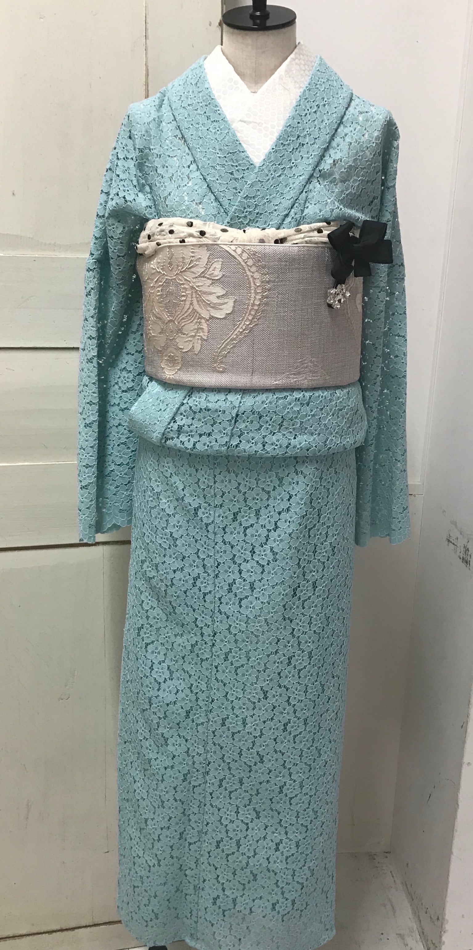 小紋小花レース着物【単衣】 ミントグリーンレース