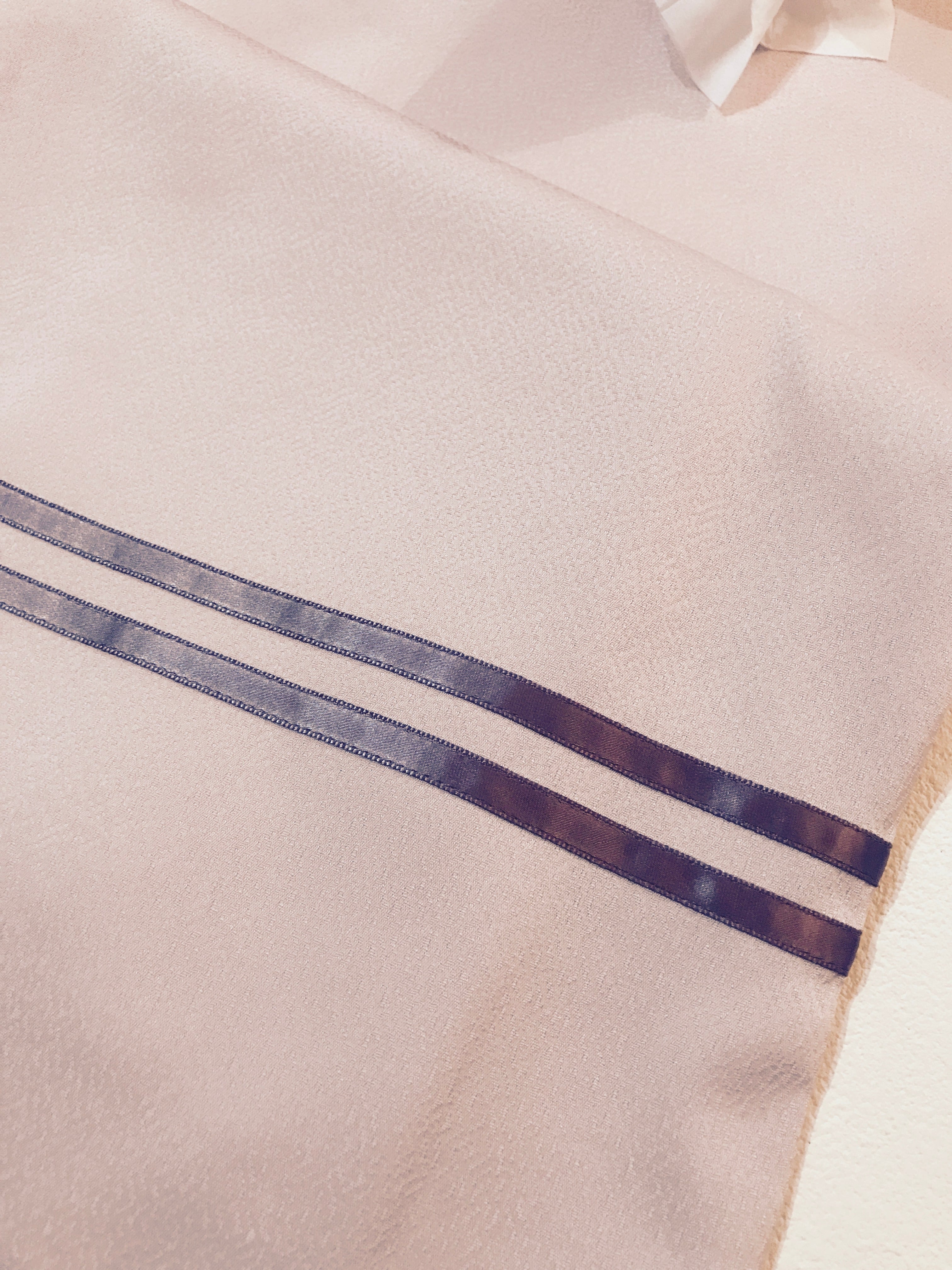マカロン色に染めあげた生地に、サテンリボンでアクセントをつけました。